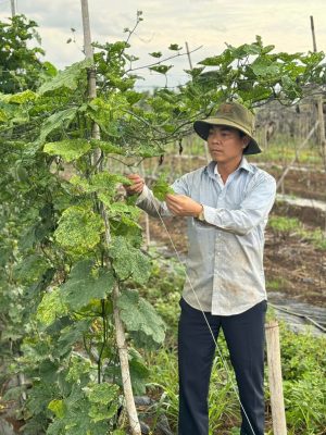Ông Lê Trọng Duyến kiểm tra mướp tại vùng nguyên liệu.